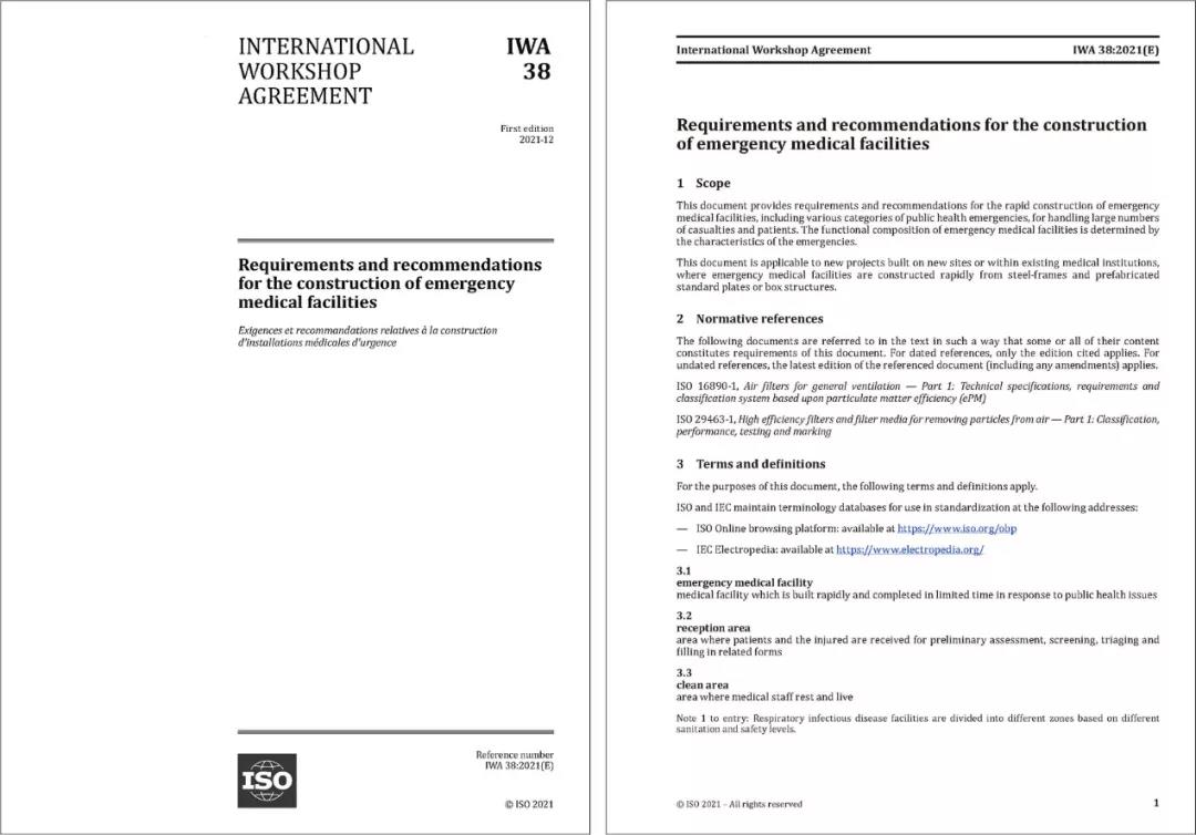 在此新冠肺炎疫情持續蔓延、亟待國際合作共同抗擊疫情之際,IWA 38《應急醫療設施建設導則》作為ISO應對新冠肺炎疫情的系列標準之一先行發布,為世界各國安全、適用、快速建設應急醫療設施提供了有力的技術支持,為中國乃至世界人類健康事業作出了巨大的貢獻。